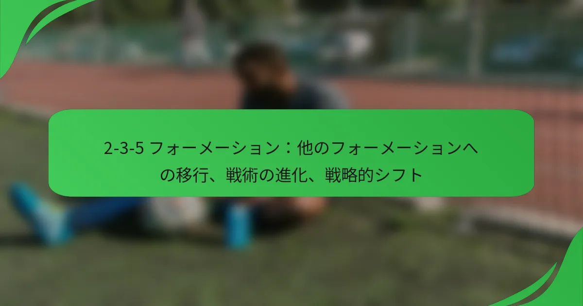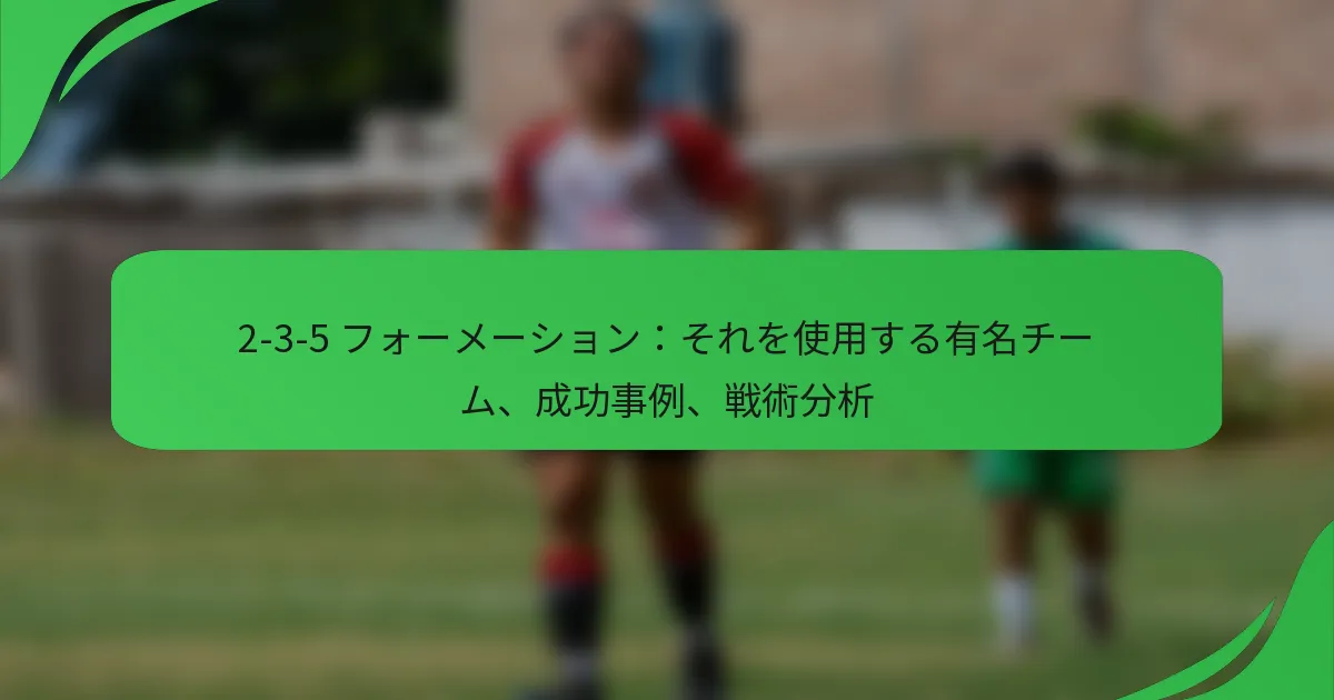 2-3-5フォーメーションは、2人のディフェンダー、3人のミッドフィールダー、5人のフォワードで構成される伝統的なサッカーのセットアップで、攻撃的なプレーとボール保持を優先します。サッカーの戦術的な風景が進化する中で、このフォーメーションも適応し、4-2-4や4-3-3といった現代的なセットアップに移行し、新たな戦略的利点を提供しています。その歴史的な重要性は、現代のゲームプレイを形作り続ける革新への道を開いてきました。 サッカーにおける2-3-5フォーメーションとは? 2-3-5フォーメーションは、2人のディフェンダー、3人のミッドフィールダー、5人のフォワードを特徴とする伝統的なサッカーのセットアップです。このフォーメーションは攻撃的なプレーを強調し、20世紀前半に広く使用され、チームがボールを支配し、多くの得点機会を創出することを可能にしました。 2-3-5フォーメーションの定義と歴史的背景 2-3-5フォーメーションは「ピラミッド」とも呼ばれ、19世紀後半に登場し、1900年代初頭に人気を博しました。これは、より攻撃的なスタイルのプレーを求める必要に応じて、ディフェンスを優先していた以前の2-2-6フォーメーションからの移行でした。2-3-5は、フィールドの幅を活用し、強力な攻撃的存在を生み出すことを可能にしました。 このフォーメーションは、サッカー戦術の進化において重要な役割を果たし、チームが攻撃と防御の両方にどのようにアプローチするかに影響を与えました。ミッドフィールダーのコントロールとフォワードの動きの重要性を強調することで、将来のフォーメーションの基盤を築きました。 2-3-5フォーメーションの主な特徴と選手の役割 2-3-5フォーメーションでは、選手の役割が明確に定義されており、攻撃の潜在能力を最大化しています。2人のディフェンダーは主に相手のフォワードを止める責任があり、3人のミッドフィールダーはディフェンスと攻撃の両方をサポートし、バックラインとフォワードの間でプレーをつなぎます。 ディフェンダー:相手の攻撃者をマークし、ディフェンスゾーンからボールをクリアすることに集中します。 ミッドフィールダー:プレーメーカーとして機能し、ボールを配分し、ディフェンスと攻撃の間を移行します。 フォワード:主にゴールを決める役割を担い、ポジショニングと動きを利用してチャンスを創出します。 この構造は流動的な動きと迅速なパスを促進し、チームが相手にプレッシャーをかけ続けることを可能にしつつ、カウンターアタックに対して脆弱であることもあります。 2-3-5フォーメーションの強みと弱み 2-3-5フォーメーションの主な強みは、その攻撃能力にあります。5人のフォワードを持つことで、チームは相手のディフェンスに対して大きなプレッシャーをかけ、多くの得点機会を創出できます。このフォーメーションは、ミッドフィールダーがフォワードをサポートし、オーバーラッピングランを行うことで、ダイナミックな攻撃スタイルを可能にします。 強み: 複数の攻撃選手による高い攻撃力。 攻撃における創造性と流動性を促進。 ボールを支配し、試合のペースをコントロールできる。 弱み: ディフェンダーが少ないため、カウンターアタックに対して脆弱。 攻撃と防御のバランスを維持するために高度なスキルを持つ選手が必要。 強力なミッドフィールダーのプレーを持つチームに利用される可能性がある。 このフォーメーションを使用するチームは、その弱点を軽減するために、ディフェンスの状況に迅速に適応する準備を整える必要があります。 2-3-5フォーメーションを利用した著名なチーム サッカーの歴史の中で、2-3-5フォーメーションを成功裏に採用した有名なチームがいくつかあります。特に、1950年代のハンガリー代表チームは、このセットアップの効果を示し、攻撃スタイルで驚異的な成功を収めました。 アーセナルやバルセロナのようなクラブも、特に支配的な時期に2-3-5のバリエーションを利用しました。これらのチームはフォーメーションの強みを効果的に活用し、多くの勝利とタイトルを獲得しました。 2-3-5フォーメーションの進化 サッカーが進化する中で、2-3-5フォーメーションは20世紀後半に徐々に人気が薄れていきました。4-4-2や4-3-3のようなよりバランスの取れたフォーメーションの台頭は、より大きなディフェンシブな組織と戦術的な柔軟性へのシフトを反映しています。 現代のフォーメーションは、特にミッドフィールダーのコントロールと攻撃プレーを強調する点で、2-3-5から要素を借りることがよくあります。コーチはこれらの原則を現代の戦略に適応させ、強力なディフェンシブな構造を維持しつつ、攻撃的な創造性を促進することに焦点を当てています。 2-3-5フォーメーションはどのように他のフォーメーションに移行するのか? 2-3-5フォーメーションは、サッカーの進化する戦術的な風景に適応し、さまざまな現代のフォーメーションに移行するこ