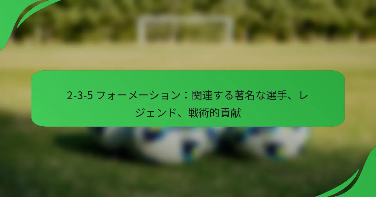 2-3-5フォーメーションは、2人のディフェンダー、3人のミッドフィルダー、5人のフォワードを特徴とし、攻撃的なスタイルを優先する歴史的なサッカー戦略です。この戦術的なセットアップは、スポーツに大きな貢献をした数々の伝説的な選手と関連付けられており、ピッチ上での記憶に残るパフォーマンスを生み出すこのフォーメーションの効果を示しています。 サッカーにおける2-3-5フォーメーションとは? 2-3-5フォーメーションは、2人のディフェンダー、3人のミッドフィルダー、5人のフォワードから成るクラシックなサッカー戦略です。このフォーメーションは攻撃的なプレーを強調し、チームが相手に対して大きなプレッシャーをかけながら、バランスの取れたミッドフィールドの存在を維持することを可能にします。 2-3-5フォーメーションの定義と構造 2-3-5フォーメーションは、通常三角形の形に配置された2人のセンターバック、3人のミッドフィルダー、5人のアタッカーで構成されています。2人のディフェンダーは相手のフォワードを止めることに集中し、ミッドフィルダーは守備と攻撃の両方をサポートします。5人のフォワードは得点機会を創出するために配置されており、高得点の試合につながることが多いです。 このフォーメーションは20世紀初頭、特に1920年代と1930年代に普及し、チームが攻撃的な戦略を優先していました。この構造は、守備から攻撃への迅速な移行を可能にし、ボール保持を支配し、得点機会を創出するチームにとって効果的です。 サッカー戦術における歴史的意義 2-3-5フォーメーションは、サッカー戦術の進化において重要な役割を果たし、より防御的なスタイルから攻撃的なプレーへのシフトを示しました。その導入により、チームはフィールド上のスペースを活用できるようになり、得点数が増加し、よりエンターテイメント性の高い試合が実現しました。 アーセナルを指揮したハーバート・チャップマンのような伝説的な選手は、2-3-5フォーメーションを効果的に活用し、その戦術的な利点を示しました。このフォーメーションの攻撃への強調は、WMや4-2-4のような将来の戦術的発展の基礎を築きました。 フォーメーションの進化 サッカーが進化するにつれて、2-3-5フォーメーションは20世紀中頃に徐々に人気を失い、チームがよりバランスの取れた柔軟なフォーメーションを採用し始めました。オフサイドルールの導入とより大きな防御の安定性の必要性が、コーチに戦略を再考させるきっかけとなりました。 現代のフォーメーション、例えば4-3-3や4-2-3-1は、ゲームに対するより微妙な理解を反映し、守備の堅実さと攻撃の華やかさの両方に焦点を当てています。今日、2-3-5はほとんど使用されていませんが、その原則は現代の戦術に影響を与え続けています。 選手の主要な役割と責任 2-3-5フォーメーションでは、各選手の役割がチームの成功にとって重要です。2人のディフェンダーは相手のフォワードをマークし、守備ゾーンからボールをクリアする役割を担っています。彼らはタックルに強く、迅速な意思決定が求められます。 3人のミッドフィルダーは、守備と攻撃の間のリンク役を果たし、ゲームのテンポをコントロールし、ボールを効果的に配分します。 5人のフォワードは得点機会を創出し、決定的なスキルが求められます。 このフォーメーションは高いフィットネスとチームワークを要求し、選手は常に守備と攻撃の役割を切り替える必要があります。 現代のフォーメーションとの比較 2-3-5フォーメーションは攻撃を強調していますが、現代のフォーメーションはよりバランスの取れたアプローチを優先することが多いです。例えば、4-3-3フォーメーションは4人のディフェンダーを配置し、より大きな防御の安定性を提供しつつ、攻撃の選択肢も残します。 2-3-5は特に迅速なカウンターアタックを利用するチームに対して守備の脆弱性を引き起こす可能性があります。対照的に、現代の戦術は流動的な選手の動きやポジションのローテーションを取り入れ、さまざまなゲーム状況に適応しやすくしています。 最終的に、2-3-5フォーメーションは攻撃的なサッカーの基礎を築きましたが、現代の戦略は攻撃と防御のバランスをより効果的に進化させ、ゲームの複雑さの増大を反映しています。 2-3-5フォーメーションに関連する著名な選手は誰ですか? 2-3-5フォーメーションは、サッカーにおけるクラシックな戦術セットアップであり、多くの伝説的な選手がこのフォーメーションに関連付けられています。このフォーメーションは、堅固なミッドフィールドとディフェンスによって支えられた強力なフォワードラインを強調し、記憶に残るパフォーマンスとスポーツへの重要な貢献を生み出します。 2-3-5フォーメーションを利用した著名な選手 2-3-5フォーメーションで活躍したいくつかのアイコニックな選手が、彼らのスキルと戦術的な意識を示しました。著名なフォワードには