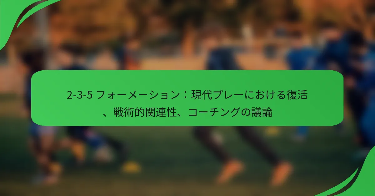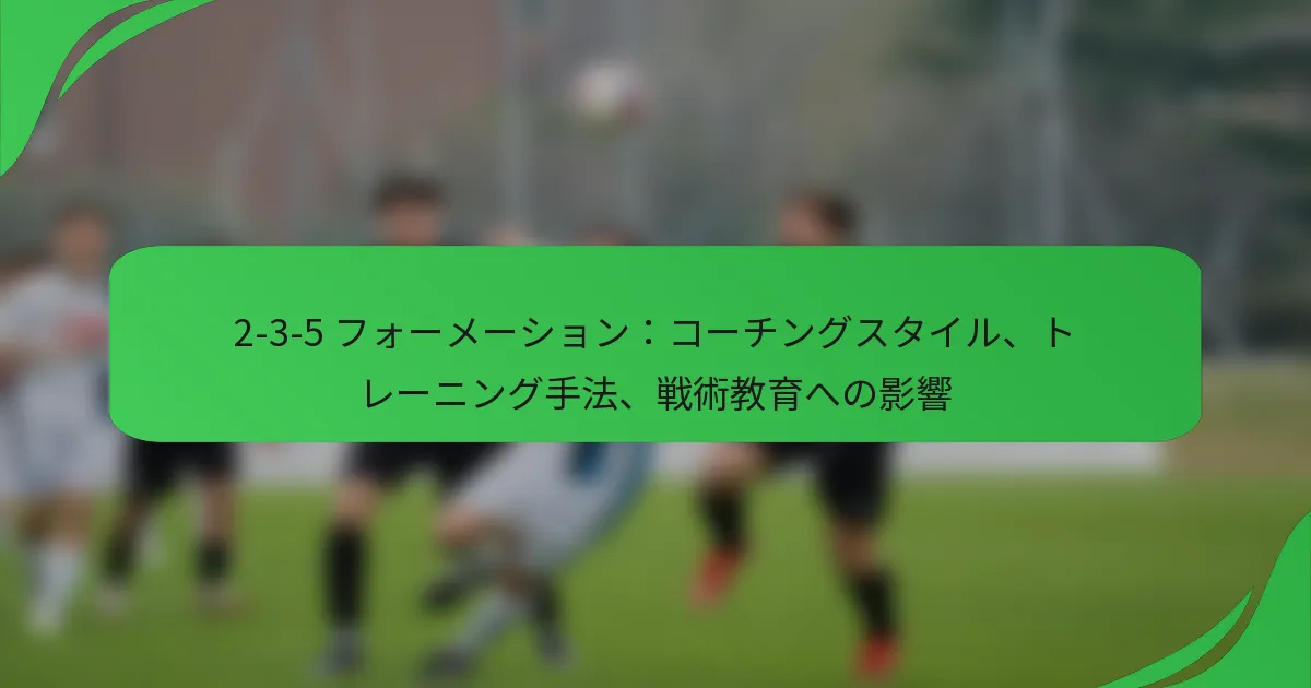 2-3-5フォーメーションは、2人のディフェンダー、3人のミッドフィールダー、5人のフォワードから成るクラシックなサッカーのセットアップで、攻撃的なプレーを強調しています。このフォーメーションの歴史的な重要性は、コーチングスタイルや戦術教育に影響を与え、攻撃戦略やポジションの柔軟性に焦点を当てることにつながりました。このフォーメーションを利用するコーチは、選手の役割、チームワーク、戦術的な意識を高めるためにトレーニング方法を適応させる必要があります。 サッカーにおける2-3-5フォーメーションとは? 2-3-5フォーメーションは、2人のディフェンダー、3人のミッドフィールダー、5人のフォワードから成るクラシックなサッカーのセットアップです。このフォーメーションは攻撃的なプレーを強調し、20世紀初頭に広く使用され、サッカーのコーチングスタイルや戦術教育に影響を与えました。 2-3-5フォーメーションの定義と歴史的な重要性 2-3-5フォーメーションは、5人のフォワードが多数の得点機会を生み出す攻撃的な構造が特徴です。19世紀後半に起源を持ち、20世紀初頭に人気を博し、チームが攻撃の潜在能力を最大化しようとした結果、このフォーメーションは採用されました。このフォーメーションは、より防御的なスタイルからのシフトを示し、サッカー戦術の進化する性質を反映しています。 歴史的に、2-3-5は現代サッカー戦略の発展に重要な役割を果たしました。チームはボールを支配し、相手に常にプレッシャーをかけることができ、高得点の試合を生み出しました。コーチはこのフォーメーションに基づいて攻撃的なドリルや選手のポジショニングを強調するためにトレーニング方法を適応させ始めました。 フォーメーション内の主要な要素と選手の役割 2-3-5フォーメーションでは、各選手が全体戦略に貢献する特定の役割を持っています。2人のディフェンダーは防御の整合性を維持しながらミッドフィールダーをサポートする役割を担います。3人のミッドフィールダーはボールの動きを促進し、防御と攻撃の間のプレーをつなぎます。5人のフォワードは、センターフォワードとウィンガーを含み、得点と得点機会の創出に焦点を当てます。 ディフェンダー:相手の攻撃を止め、カウンター攻撃を開始する責任があります。 ミッドフィールダー:ゲームのテンポをコントロールし、ボールを効果的に配分します。 フォワード:主に得点に焦点を当て、防御の弱点を突きます。 2-3-5フォーメーションの進化 サッカーが進化するにつれて、2-3-5フォーメーションはプレースタイルの変化に適応するために修正が加えられ始めました。コーチはより多くのディフェンダーを含むバリエーションを実施し、4-2-4や4-3-3のようなフォーメーションが生まれました。これらの適応は、攻撃能力と防御の安定性のバランスを取ることを目的としています。 ゾーンマーキングや戦術的な柔軟性の導入は、2-3-5の進化にさらに影響を与えました。コーチは、相手の戦略に対抗するためにフォーメーションの適応が必要であることを認識し、より多様なセットアップに移行する中で、2-3-5の厳格な使用が減少しました。 現代のフォーメーションとの比較 現代のフォーメーションは、よりバランスの取れたアプローチにシフトし、追加のディフェンダーを組み込むことがよくあります。以下は、2-3-5フォーメーションといくつかの現代的なセットアップの比較です: フォーメーション ディフェンダー ミッドフィールダー フォワード 主要な焦点 2-3-5 2 3 5 高い攻撃、低い防御 4-4-2 4 4 2 バランスの取れたプレー 4-3-3 4 3 3 サポートを伴う攻撃 フォーメーションの視覚的表現と図 2-3-5フォーメーションの視覚的な図は、その構造と選手のポジショニングを示しています。通常、2人のディフェンダーは中央に配置され、3人のミッドフィールダーが前方に三角形を形成します。5人のフォワードは前線に広がり、攻撃における幅と深さを生み出します。 図は異なる場合がありますが、一般的には次のようにフォーメーションを示します: ディフェンダー:後方に配置され、防御を担当します。 ミッドフィールダー:ラインまたは三角形に配置され、プレーを促進します。 フォワード:前方に広がり、得点機会を最大化します。 2-3-5フォーメーションはコーチングスタイルにどのように影響するか? 2-3-5フォーメーションは、攻撃的なプレーとポジションの柔軟性を強調することで、コーチングスタイルに大きな影響を与えます。このフォーメーションを採用するコーチは、選手のパフォーマンスを最適化するために、トレーニング方法や戦術教育をシフトさせる必要があります。 2-3-5フォーメーションに関連するコーチング哲学 2-3-5フォーメーションを利用するコーチは、通常、攻撃的なプレーとチームワークを優先する哲学を受け入れます。このフォーメーションは、選手がポジションを入れ替えることが期待される流動的な