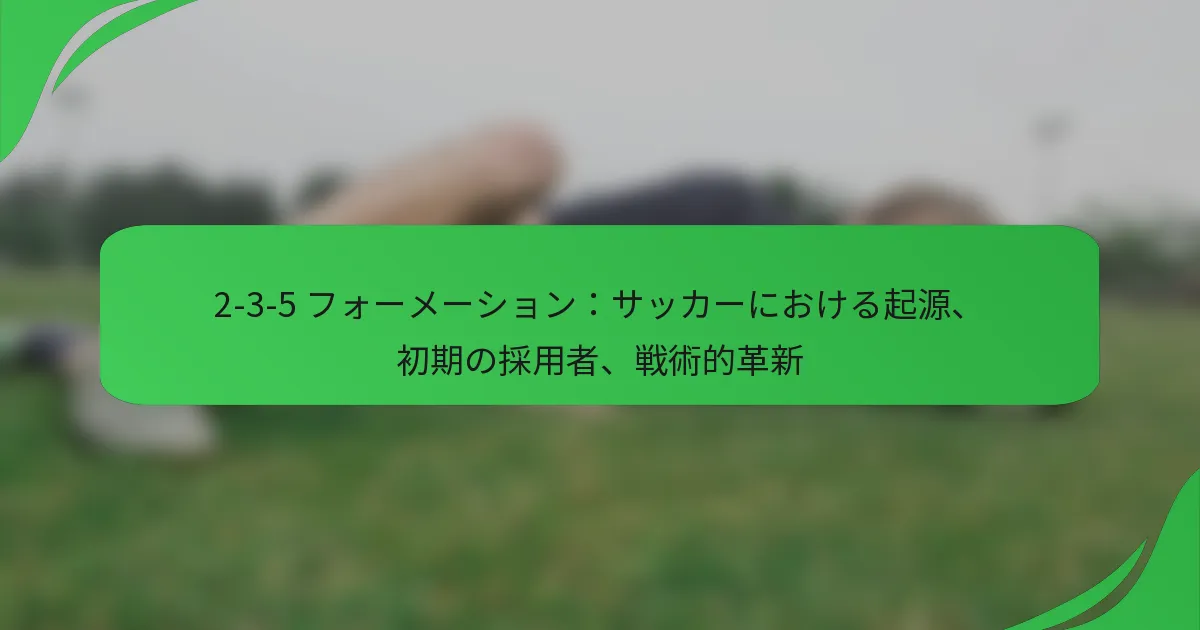 2-3-5フォーメーションは、2人のディフェンダー、3人のミッドフィールダー、5人のフォワードから成るクラシックなサッカー戦術で、攻撃的なプレーを優先するように設計されています。19世紀後半から20世紀初頭に広く採用され、チームが攻撃の潜在能力を最大限に引き出しつつ、バランスの取れたミッドフィールダーを維持することを可能にしました。このフォーメーションは、初期のサッカー戦術を形成しただけでなく、その後の戦術革新の基礎を築き、戦略における柔軟性の重要性を強調しました。 サッカーにおける2-3-5フォーメーションとは? 2-3-5フォーメーションは、2人のディフェンダー、3人のミッドフィールダー、5人のフォワードから成るクラシックなサッカー戦術です。この構造は攻撃的なプレーを強調し、相手のディフェンスを圧倒しつつ、バランスの取れたミッドフィールダーの存在を維持することを目指しています。 2-3-5フォーメーションの定義と構造 2-3-5フォーメーションは、フィールド上の選手の配置によって特徴付けられます。2人のディフェンダーは後方に配置され、チームの基盤を提供します。3人のミッドフィールダーはディフェンスと攻撃の両方をサポートし、5人のフォワードは主にゴールを狙います。 このフォーメーションは強力な攻撃の存在を可能にし、5人のフォワードが多数の得点機会を生み出すことができます。しかし、ディフェンダーの数が限られているため、カウンターアタックに対してチームが脆弱になる可能性があります。 歴史的背景と発展のタイムライン 年 出来事 1880年代 2-3-5フォーメーションがサッカーにおける最初の戦術的セットアップの一つとして登場。 1920年代 アーセナルやマンチェスター・シティなどのチームがこのフォーメーションを採用し、イングランドのフットボールでの人気を高める。 1950年代 4-4-2などのより守備的なフォーメーションの台頭が2-3-5を影に隠れさせ始める。 当初、2-3-5はその攻撃的な潜在能力から広く使用されていました。サッカーが進化するにつれて、チームは守備戦略を優先するようになり、このフォーメーションの使用が減少しました。それでも、その歴史的意義は残り、現代の戦術に影響を与えています。 フォーメーションの背後にある主要な戦術的原則 攻撃的焦点: 5人のフォワードを持つ2-3-5は得点を優先し、攻撃のサードを支配することを目指します。 ミッドフィールダーのサポート: 3人のミッドフィールダーはディフェンスと攻撃をつなぐ重要な役割を果たし、ボールの動きを促進します。 守備の脆弱性: 限られた数のディフェンダーはカウンターアタックに対して弱点をもたらす可能性があります。 これらの原則は、2-3-5フォーメーションにおける攻撃と守備のバランスを強調しています。チームは、攻撃能力を最大化しつつ、守備で数的不利になるリスクを効果的に管理しなければなりません。 他のフォーメーションとの比較 現代のフォーメーション、例えば4-4-2や4-3-3は、2-3-5と比較して攻撃と守備のバランスの取れたアプローチを提供します。例えば、4-4-2はより強力な守備ラインを提供しつつ、攻撃オプションとして2人のフォワードを維持します。 対照的に、2-3-5の攻撃重視は高得点の試合を生む可能性がありますが、組織的なディフェンスに直面した際にはチームが脆弱になることがあります。これらの違いを理解することで、チームは自らの強みと弱みに基づいて適切なフォーメーションを選択することができます。 2-3-5フォーメーションに関する一般的な誤解 一般的な誤解の一つは、2-3-5が時代遅れで現代サッカーでは効果的でないというものです。今日では一般的に使用されていないかもしれませんが、その原則は依然として攻撃戦略や選手の配置に影響を与えることができます。 もう一つの神話は、このフォーメーションが守備能力に欠けるというものです。ディフェンダーが少ないにもかかわらず、チームはミッドフィールダーに守備フェーズで後退するよう指示するなどの戦術的調整を実施することで、この弱点を軽減できます。 これらの誤解を理解することで、コーチや選手は2-3-5フォーメーションの歴史的背景と現代サッカー戦術における潜在的な応用を評価することができます。 2-3-5フォーメーションの初期の採用者は誰か? 攻撃的スタイルで知られる2-3-5フォーメーションは、19世紀後半から20世紀初頭にかけて広く採用されました。チームはこのフォーメーションを利用して攻撃の潜在能力を最大化し、堅固な守備を維持し、サッカー戦術の進化に大きな影響を与えました。 2-3-5フォーメーションを利用した著名なチーム 2-3-5フォーメーションは、そのピーク時にいくつかのチームと同義語となりました。以下のクラブがその例です: シェフィールド・ユナイテッド ウェスト・ブロムウィッチ・アルビオン アーセナル バルセロナ これらのチームは、試合を支配するためにこのフォーメーションを