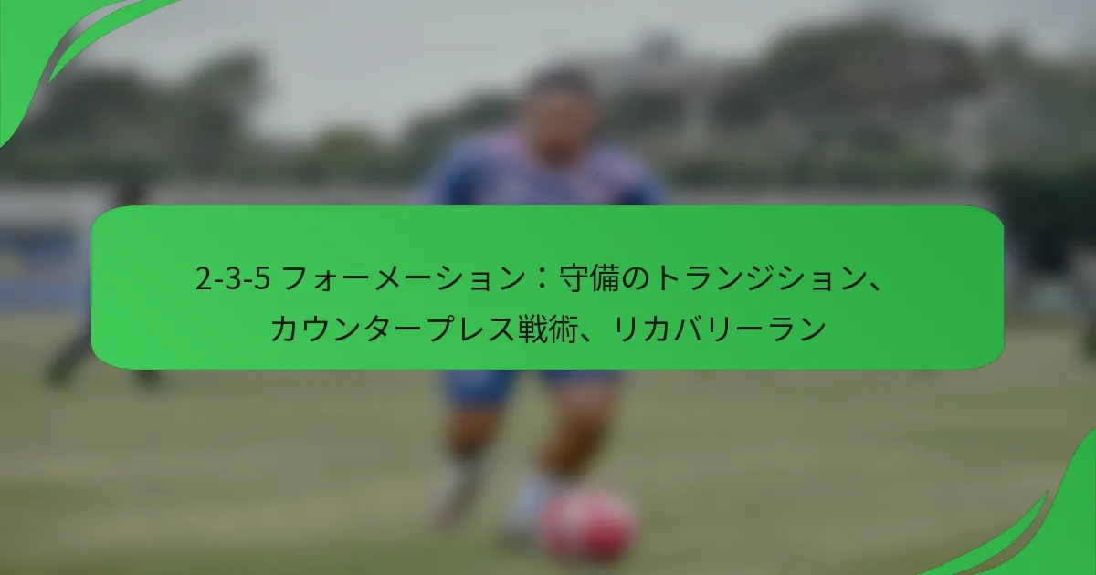 2-3-5フォーメーションは、2人のディフェンダー、3人のミッドフィルダー、5人のフォワードの配置によって攻撃的なプレーを優先する伝統的なサッカーのセットアップです。その効果的な運用には、ボールを失った際に迅速に守備の姿勢に移行するディフェンシブ・トランジションや、相手の隙を突いてボールを素早く奪い返すカウンター・プレス戦術が重要です。また、選手は戻って守備をサポートし、チームの構造を維持し、相手の得点機会を最小限に抑えるために、回復ランも欠かせません。 サッカーにおける2-3-5フォーメーションとは? 2-3-5フォーメーションは、2人のディフェンダー、3人のミッドフィルダー、5人のフォワードから成る伝統的なサッカーのセットアップです。このフォーメーションは攻撃的なプレーを強調し、得点機会を創出することを目指しながら、コンパクトなミッドフィールドで守備と攻撃の両方をサポートします。 2-3-5フォーメーションの歴史的背景 2-3-5フォーメーションは19世紀後半に登場し、20世紀初頭から中頃にかけて広く使用されました。これは、以前の2-2-6フォーメーションからのシフトを表し、チームがより攻撃的なスタイルを採用することを可能にしました。時間が経つにつれ、ゲームが進化する中で、守備の組織化の重要性が増したため、このフォーメーションは次第に一般的ではなくなりました。 このフォーメーションは、サッカーの初期に特に人気があり、チームは得点の可能性を最大化することに焦点を当てていました。2-3-5は戦術的な発展において重要な役割を果たし、4-2-4や4-3-3などの後のフォーメーションに影響を与えました。 2-3-5フォーメーションの主な特徴 2-3-5フォーメーションは、攻撃的な選手を優先する独自の選手配置によって定義されます。2人のディフェンダーはバックラインをカバーし、3人のミッドフィルダーは守備と攻撃の両方をサポートします。5人のフォワードは、流動的な動きと迅速なトランジションを可能にする配置が一般的です。 2人のセンターバックは相手のフォワードをマークします。 3人のミッドフィルダーは守備と攻撃をつなぎ、しばしば両方の役割を担います。 5人のフォワードは複数の攻撃オプションを生み出し、相手の守備をオーバーロードします。 このセットアップはダイナミックな攻撃プレーを生む可能性がありますが、守備の脆弱性を避けるためには規律あるポジショニングが必要です。 2-3-5フォーメーションにおける選手の役割と責任 2-3-5フォーメーションでは、各選手の役割が攻撃と守備のバランスを維持するために重要です。2人のディフェンダーは相手の攻撃を阻止し、危険からボールをクリアする役割を担います。彼らは相手のフォワードからの脅威を管理するために効果的にコミュニケーションをとる必要があります。 3人のミッドフィルダーはチームのエンジンとして機能し、ボールの動きを促進し、守備の努力と攻撃のプレーをサポートします。彼らは多才であり、役割間の迅速な移行が求められます。 5人のフォワードは主に得点を決める責任があります。彼らのポジショニングはスペースとチャンスを生み出すべきであり、一部の選手はフィニッシュに集中し、他の選手はプレーメイキングをサポートします。フォワード間の連携は得点機会を最大化するために不可欠です。 2-3-5フォーメーションの利点 2-3-5フォーメーションの主な利点は、その攻撃力です。5人のフォワードを持つことで、チームは相手の守備に常に圧力をかけ、多くの得点機会を生み出すことができます。このフォーメーションは攻撃的なプレーを促進し、高得点の試合を引き起こす可能性があります。 もう一つの利点は、攻撃戦略における柔軟性です。チームはフィールド上のさまざまな角度やスペースを利用できるため、相手が動きを予測するのが難しくなります。この予測不可能性は、組織化された守備を崩すのに有利です。 2-3-5フォーメーションの欠点 攻撃の可能性にもかかわらず、2-3-5フォーメーションには特に守備の安定性に関して重大な欠点があります。ディフェンダーが2人しかいないため、チームはカウンターアタックに対して脆弱になりがちで、特にミッドフィルダーが前方に出すぎると危険です。これにより、守備の隙間を突かれる迅速なトランジションが発生する可能性があります。 さらに、5人のフォワードに依存することでミッドフィールドのコントロールが欠如し、ボールを保持するのが難しくなることがあります。チームはボールを失った後に奪い返すのに苦労し、守備の崩壊を引き起こす可能性があります。 コーチは2-3-5フォーメーションを採用する際に、これらの脆弱性を慎重に考慮し、選手がポジショニングにおいて規律を保ち、トランジション中の責任を理解していることを確認する必要があります。 2-3-5フォーメーションにおける守備のトランジションはどのように機能するか? 2-3-5フォーメーションに