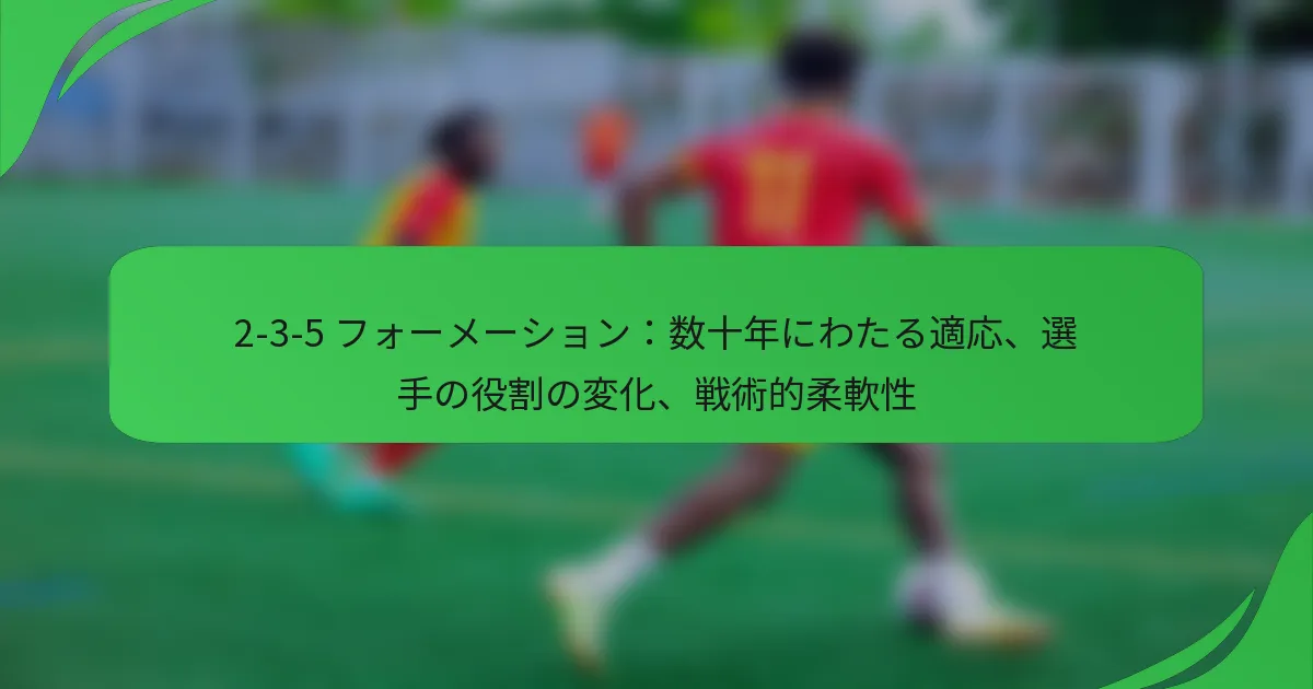 2-3-5フォーメーションは、2人のディフェンダー、3人のミッドフィールダー、5人のフォワードから成るクラシックなサッカー戦略で、攻撃的なプレーを強調しつつ、守備のバランスを維持します。数十年にわたり、このフォーメーションは進化し、選手の役割は変化する戦術的要求に応じて適応し、フィールド上での柔軟性を高めています。その結果、チームは攻撃と守備の戦略を切り替えることができ、試合状況に対してよりダイナミックに対応できるようになります。 サッカーにおける2-3-5フォーメーションとは? 2-3-5フォーメーションは、2人のディフェンダー、3人のミッドフィールダー、5人のフォワードから成るクラシックなサッカー戦略です。このセットアップは、攻撃的なプレーを強調しつつ、守備のバランスを維持することから、サッカー戦術の進化において歴史的に重要な意味を持っています。 定義と歴史的意義 2-3-5フォーメーションは19世紀後半に登場し、20世紀初頭に広く採用されるようになりました。これは、攻撃的なプレーを優先する最初のフォーメーションの一つであり、チームが強力な攻撃力を発揮できるようにしました。このフォーメーションは、サッカーにおける将来の戦術的発展の基礎を築きました。 歴史的に見て、2-3-5は純粋に守備的な戦略からよりダイナミックなプレースタイルへのシフトをもたらしたため、重要でした。このフォーメーションを採用したチームは試合を支配することが多く、世界中のさまざまなリーグで人気を博しました。 フォーメーションの主要な要素 ディフェンダー:相手のフォワードを止め、カバーを提供する2人の選手。 ミッドフィールダー:守備と攻撃をつなぐ3人の選手で、試合のテンポをコントロールすることが多い。 フォワード:得点を狙う5人の選手で、通常はウイングとセンターフォワードを含む。 2-3-5の選手配置は、守備と攻撃の間で流動的な移行を可能にします。ミッドフィールダーは、守備とフォワードの両方をサポートする重要な役割を果たし、プレーメイキングやボールの効果的な配分に関与します。 このフォーメーションは攻撃能力を重視しているため、チームは攻撃の状況で数的優位を持つことが多く、得点機会を生み出しやすくなります。 フォーメーションの進化 サッカー戦術が進化するにつれて、2-3-5フォーメーションはプレースタイルの変化に適応し始めました。20世紀中頃には、チームがより守備的な戦略を取り入れ始め、4-4-2や4-3-3のようなフォーメーションが発展しました。これらのフォーメーションは、攻撃オプションを維持しながら、より高い守備の安定性を提供しました。 人気が低下したにもかかわらず、現代のフォーメーションには2-3-5の要素がまだ見られます。たとえば、ウイングプレーやフルバックのオーバーラップランに対する強調は、2-3-5の原則に遡ることができます。 現代サッカー戦術への影響 2-3-5フォーメーションは、特にチームが攻撃プレーにアプローチする方法において、現代サッカー戦術に持続的な影響を与えています。攻撃的なプレッシャーに焦点を当てたこのフォーメーションは、幅と攻撃の深さを優先する現代のフォーメーションに影響を与えています。 現代のチームは、複数のフォワードとダイナミックなミッドフィールダーを利用して攻撃の勢いを維持するために、2-3-5からインスピレーションを得ることがよくあります。このアプローチは、選手間の流動的な動きとポジションの入れ替えを促進し、全体的なチームパフォーマンスを向上させます。 2-3-5を採用した著名なチーム サッカーの歴史の中で、2-3-5フォーメーションを成功裏に採用した著名なチームがいくつかあります。初期の採用者には、1950年代のシェフィールド・ユナイテッドやハンガリー代表が含まれ、このフォーメーションの効果を高い緊張感のある試合で示しました。 さらに、1970年のワールドカップでのブラジル代表は、2-3-5のバリエーションを利用し、その適応性と効果を世界舞台で示しました。これらのチームは、フォーメーションを使用して攻撃的なスタイルを生み出しつつ、守備の組織を維持する方法を体現しました。 2-3-5フォーメーションにおける選手の役割はどのように変化したか? 2-3-5フォーメーションでは、選手の役割が数十年にわたり大きく変化し、進化する戦術的要求や選手の専門化に適応しています。伝統的なポジションは変化し、フォワード、ミッドフィールダー、ディフェンダーの新しい責任が生まれ、フィールド上での戦術的柔軟性が向上しました。 2-3-5におけるフォワードの伝統的な役割 クラシックな2-3-5セットアップでは、フォワードは主に得点と得点機会の創出を担当していました。これは、彼らがより静的な方法でプレーし、ポジショニングやフィニッシングスキルに依存することを意味しました。 ゲームが進化するにつれて、フォワードの役割はより多様性を持つようになりました。この