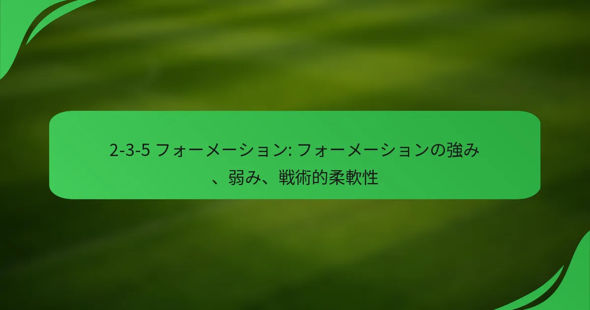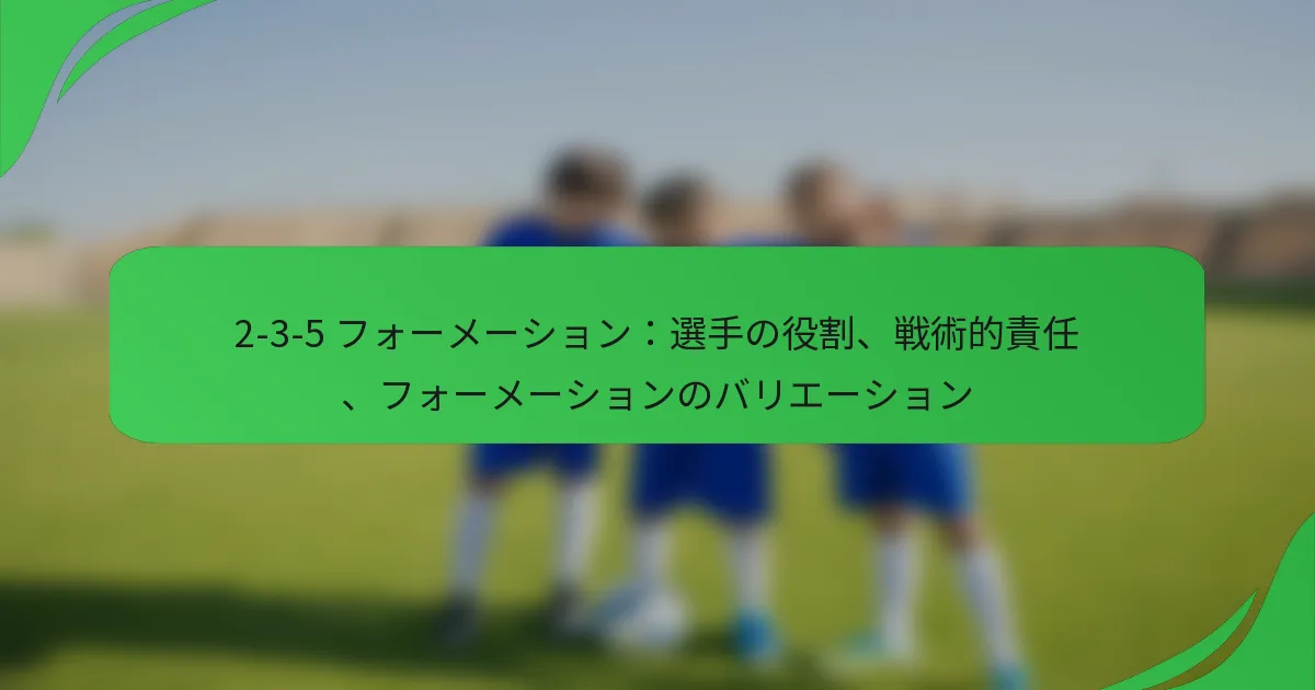 2-3-5フォーメーションは、2人のディフェンダー、3人のミッドフィールダー、5人のフォワードという独特の配置が特徴で、それぞれの役割が攻撃と守備の両方において重要です。このフォーメーションは攻撃的なプレースタイルを促進しつつ、選手が堅固な守備構造を維持することを求めます。さらに、2-3-5のさまざまな適応により、選手の役割や戦略を変更し、異なる戦術的シナリオや相手の強さにより適したものにすることができます。 2-3-5フォーメーションにおける選手の役割は何ですか? 2-3-5フォーメーションは、2人のディフェンダー、3人のミッドフィールダー、5人のフォワードという明確な配置を特徴としています。各ポジションには、攻撃と守備の戦略に貢献する特定の責任があり、これらの役割を理解することは効果的なゲームプレイにとって不可欠です。 2-3-5フォーメーションにおけるフォワードの責任 2-3-5フォーメーションのフォワードは、主にゴールを決めたり攻撃の機会を創出したりする役割を担っています。彼らは敏捷性があり、強力なフィニッシュスキルを持ち、守備の弱点を突くためにゲームを読む能力が必要です。 各フォワードは通常、センターフォワードのようにプレーを決めることに焦点を当てる役割や、ウイングのようにディフェンスを引き伸ばしクロスを供給する役割を持っています。このダイナミックさにより、多様な攻撃オプションが生まれ、相手のディフェンスに圧力をかけることができます。 センターフォワード:主なゴールスコアラーで、プレーを決めるために中央に位置します。 ウイング:幅を提供し、ボールをクロスし、得点機会を創出します。 インサイドフォワード:得点とプレーメイキングの両方をサポートし、しばしば内側に切れ込んでシュートを打ちます。 2-3-5フォーメーションにおけるミッドフィールダーの責任 このフォーメーションのミッドフィールダーは、守備と攻撃のリンク役を果たし、プレーメイキングとボール配分に焦点を当てます。彼らはゲームのテンポをコントロールし、守備から攻撃への移行を促進する必要があります。 通常、1人のミッドフィールダーはより守備的な役割を担い、バックラインを守る手助けをし、他の2人は攻撃をサポートするために前に出ます。このバランスは、ボール保持と得点機会の創出にとって重要です。 ディフェンシブミッドフィールダー:守備を保護し、相手のプレーを破壊します。 センターミッドフィールダー:ボールを配分し、守備と攻撃をつなぎます。 アタッキングミッドフィールダー:フォワードをサポートし、得点機会を創出します。 2-3-5フォーメーションにおけるディフェンダーの責任 2-3-5フォーメーションのディフェンダーは、ゴールを守り、相手選手が得点するのを防ぐ重要な役割を担っています。ディフェンダーが2人しかいないため、彼らは非常に組織的であり、スペースをカバーするために効果的にコミュニケーションをとる必要があります。 これらのディフェンダーはしばしば1対1の状況に関与し、タックルやパスのインターセプトに熟練している必要があります。彼らのポジショニングは重要で、攻撃者をマークすることと、移行時にミッドフィールダーをサポートすることのバランスを取る必要があります。 センターバック:主なディフェンダーで、相手のフォワードをマークする責任があります。 フルバック:守備をサポートし、攻撃支援のためにミッドフィールダーと重なります。 2-3-5フォーメーションにおけるゴールキーパーの役割 ゴールキーパーは2-3-5フォーメーションにおける最後の防衛線であり、シュートを止め、守備を組織する責任があります。彼らは迅速で敏捷であり、さまざまな角度からのシュートに反応できる必要があります。 シュートをセーブするだけでなく、ゴールキーパーはボールを効果的に配分することで攻撃を開始する重要な役割を果たします。投げるか蹴るかの方法でボールを配分します。ゲームを読む能力とディフェンダーとのコミュニケーション能力は、守備の堅実さを維持するために不可欠です。 各ポジションに必要な主要スキル 2-3-5フォーメーションの各ポジションには、効果的なパフォーマンスを確保するために特定のスキルが求められます。これらのスキルを理解することで、選手は自分のゲームを発展させ、役割をより効果的に果たすことができます。 フォワード:フィニッシング、ポジショニング、スピード。 ミッドフィールダー:パス精度、視野、スタミナ。 ディフェンダー:タックル、マーク、空中能力。 ゴールキーパー:反射神経、コミュニケーション、配分スキル。 2-3-5フォーメーションにおける戦術的責任はどのように現れるか? 2-3-5フォーメーションは、構造化された守備を維持しながら攻撃的なプレースタイルを強調します。各選手の戦術的責任は、攻撃と守備の義務のバランスを取るために重要であり、効果的な移行を確保し、チーム