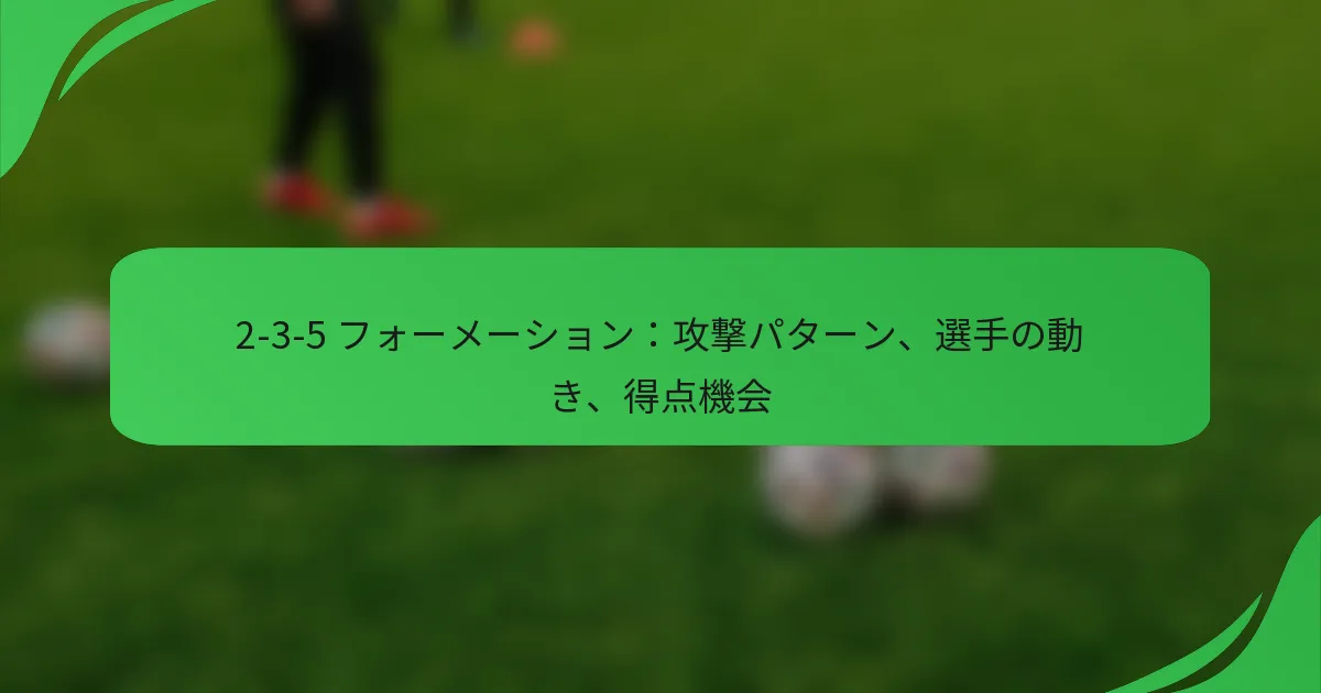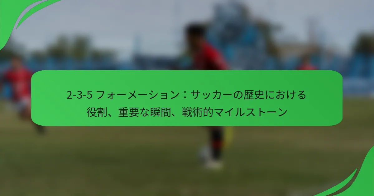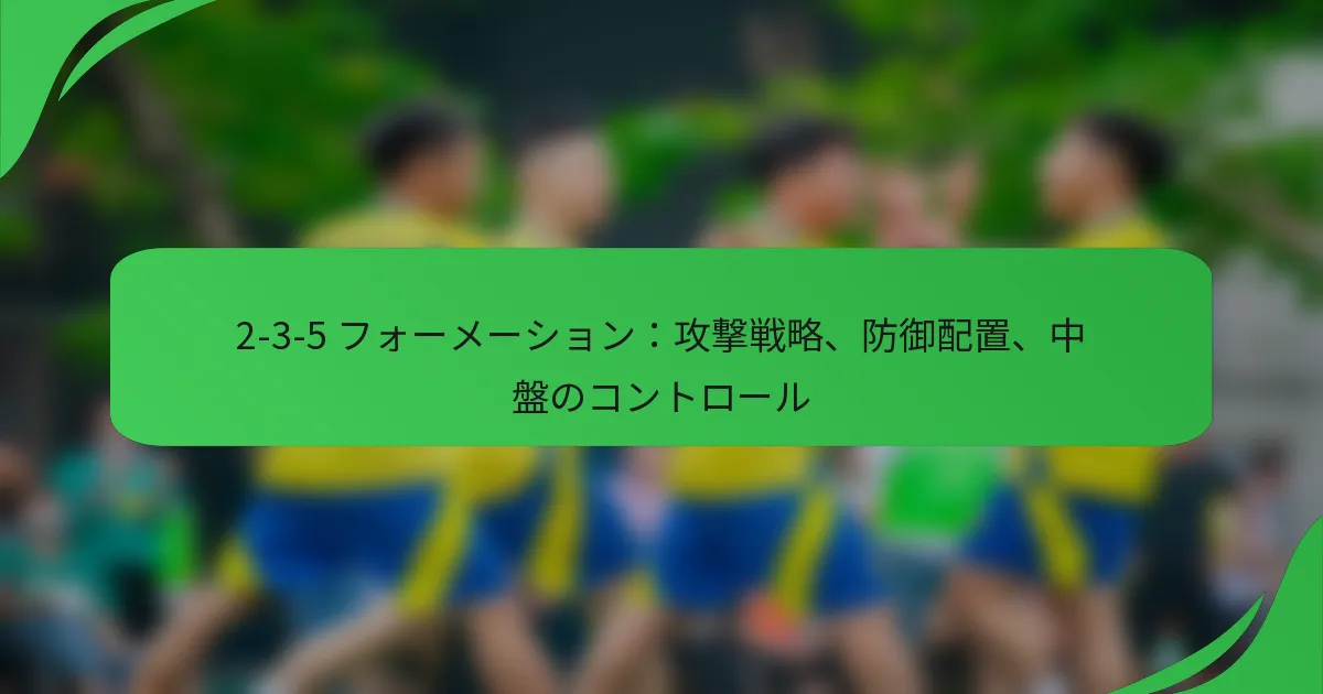 2-3-5フォーメーションは、2人のディフェンダー、3人のミッドフィールダー、5人のフォワードを特徴とする、攻撃的な戦略を優先するクラシックなサッカーのセットアップです。このフォーメーションは、選手のダイナミックな動きを可能にし、フィールドの幅と深さを活用することで、多くの得点機会を生み出します。 サッカーにおける2-3-5フォーメーションとは? 2-3-5フォーメーションは、2人のディフェンダー、3人のミッドフィールダー、5人のフォワードを特徴とするクラシックなサッカーのセットアップです。このフォーメーションは攻撃的なプレーを強調し、20世紀前半に広く使用され、強力な攻撃戦略を示しました。 2-3-5フォーメーションの定義と歴史的背景 2-3-5フォーメーションは「ピラミッド」とも呼ばれ、1800年代後半から1930年代まで広く普及していました。このフォーメーションは、フォワードプレーに重点を置くことで得点機会を最大化するように設計されていました。この構造により、チームはボールの保持を支配し、多くの攻撃チャンスを生み出すことができました。 歴史的に、このフォーメーションはサッカーがより防御的なスタイルから攻撃的な戦術を取り入れる時代に出現しました。2-3-5は現代サッカー戦略の形成に重要な役割を果たし、チームが攻撃と防御の両方のフェーズにどのようにアプローチするかに影響を与えました。 フォーメーション内の主要な要素と選手の役割 2-3-5フォーメーションでは、各選手が全体の戦略に貢献する特定の役割を持っています。2人のディフェンダーはゴールを守り、後方からプレーを開始する役割を担います。3人のミッドフィールダーは防御と攻撃のリンク役を果たし、ゲームのテンポをコントロールし、フォワードにボールを配分します。 ディフェンダー:相手のフォワードをマークし、守備ゾーンからボールをクリアする責任があります。 ミッドフィールダー:トランジションを促進し、防御と攻撃の両方をサポートするプレーメーカーです。 フォワード:得点を狙い、ポジショニングと動きを利用してチャンスを作ります。 このフォーメーションでは、選手が攻撃と防御の役割のバランスを維持するために、優れたコミュニケーションと役割の理解が求められます。 現代サッカーにおける2-3-5フォーメーションの進化 サッカーが進化するにつれて、2-3-5フォーメーションは4-4-2や4-3-3などのよりバランスの取れたセットアップに取って代わられました。これらの現代のフォーメーションは、より高い防御の安定性を提供しながら、効果的な攻撃プレーを可能にします。このシフトは、戦術的な柔軟性の重要性とさまざまなゲーム状況に適応する必要性を反映しています。 プロのプレーでの衰退にもかかわらず、2-3-5の原則は現代の戦略にも見ることができます。チームはしばしばこのフォーメーションの要素を取り入れ、高いプレッシングや流動的な攻撃の動きを利用して防御の弱点を突きます。 現代のフォーメーションとの比較 フォーメーション ディフェンダー ミッドフィールダー フォワード 主要な焦点 2-3-5 2 3 5 攻撃重視、最小限の防御 4-4-2 4 4 2 バランスの取れたプレー、防御の安定性 4-3-3 4 3 3 流動的な攻撃、強力なミッドフィールダーのコントロール 2-3-5フォーメーションは攻撃的なスタイルを強調しますが、現代のフォーメーションはよりバランスの取れたアプローチを優先し、チームが効果的に防御しながら得点機会を創出できるようにしています。 2-3-5フォーメーションにおける攻撃パターンの機能は? 2-3-5フォーメーションは、幅と深さを強調する独特の攻撃パターンを採用しており、チームが多くの得点機会を創出できるようにします。この構造は5人のフォワードを配置し、ダイナミックな動きと戦略的なプレーを可能にし、防御の弱点を突くことができます。 一般的な攻撃戦略の概要 2-3-5フォーメーションでは、チームは攻撃の潜在能力を最大化するためにさまざまな攻撃戦略を利用します。主要なアプローチには、ウィングプレー、素早いワンツーパス、特定のエリアでのオーバーロードが含まれます。 ウィングプレーは特に効果的で、ディフェンスを引き伸ばし、フォワードが活用できるスペースを作ります。素早いワンツーパスはディフェンスラインを混乱させ、選手がスピードで突破することを可能にします。特定のエリアでのオーバーロードは、ディフェンダーに難しい選択を強いることが多く、ミスマッチを生むことがあります。 攻撃プレー中の選手のポジショニング 選手のポジショニングは2-3-5フォーメーションにおいて重要であり、チームが防御から攻撃にどれだけ効果的に移行できるかを決定します。フォワードは三角形を作るようにポジショニングし、ボールの素早い動きとボール保持者へのオプションを促進します。 ミッドフィールダーはフォワードをサポートする重要な役割を果たし、しばしば後方に下がってボール