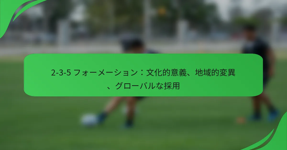 2-3-5フォーメーションは、2人のディフェンダー、3人のミッドフィールダー、5人のフォワードから成る初期のサッカー戦術で、攻撃的なプレーを強調し、相手を圧倒することを目的としています。その文化的意義は、戦術戦略の重要な進化としての役割にあり、ゲームに対する世界的な認識に影響を与えています。地域ごとに進化する中で、このフォーメーションは地元のスタイルや歴史的文脈を示し、サッカーに対する多様な文化的影響を反映しています。 サッカーにおける2-3-5フォーメーションとは? 2-3-5フォーメーションは、2人のディフェンダー、3人のミッドフィールダー、5人のフォワードから成る初期のサッカー戦術です。このフォーメーションは攻撃的なプレーを強調し、基本的な守備構造を維持しながら、攻撃オプションで相手を圧倒することを目指します。 2-3-5フォーメーションの定義と歴史的背景 2-3-5フォーメーションは19世紀後半に登場し、20世紀初頭までサッカー戦術を支配しました。これは、ゲームの身体的な要素の増加と、より構造化されたプレーの必要性に応じたものでした。サッカーが進化する中で、このフォーメーションはチームが攻撃的な戦略を通じて相手の弱点を突くことを可能にしました。 歴史的に、2-3-5はさまざまなリーグで広く採用され、特にイングランドや南アメリカで顕著でした。アーセナルの初期のバージョンやブラジル代表チームのようなチームは、このフォーメーションを効果的に利用し、国内外の大会で大きな成功を収めました。 2-3-5フォーメーションの主要な要素と選手の役割 2-3-5フォーメーションでは、各選手が攻撃と守備の戦略に貢献する特定の役割を持っています。主要な要素は以下の通りです: ゴールキーパー:最後の防衛線で、ゴールへのシュートを阻止する役割を担います。 ディフェンダー:相手のフォワードをマークし、守備ゾーンからボールをクリアする2人の選手。 ミッドフィールダー:守備と攻撃をつなぎ、ボールをコントロールし、パスを配分する3人の選手。 フォワード:主にゴールを狙う5人の選手で、相手のゴールに近い位置に配置されることが多いです。 この構造は、ミッドフィールダーがフォワードをサポートしつつ、ある程度の守備カバーを提供することで、ダイナミックな攻撃アプローチを可能にします。しかし、フォワードの数が多いため、カウンターアタックに対してチームが脆弱になる可能性があります。 2-3-5フォーメーションの進化 2-3-5フォーメーションは、その誕生以来、重要な変化を遂げてきました。チームがよりバランスの取れたアプローチの重要性を認識するようになると、バリエーションが生まれ、3-2-2-3や4-2-4のようなフォーメーションが発展しました。これらの適応は、攻撃の圧力を維持しつつ、守備の安定性を向上させることを目的としています。 20世紀中頃には、4-4-2や4-3-3フォーメーションの台頭が戦術的思考の変化を示しました。コーチはミッドフィールダーのコントロールと守備の堅実さを優先し、フォワードに偏った2-3-5から離れるようになりました。それにもかかわらず、2-3-5の原則は、攻撃的なプレーを強調する現代のフォーメーションに今でも見られます。 他のサッカーフォーメーションとの比較 2-3-5フォーメーションを現代の戦術と比較すると、いくつかの重要な違いが浮かび上がります。2-3-5は攻撃に重きを置いているのに対し、現代のフォーメーションは攻撃と守備の責任をバランスよく配分することが多いです。例えば、4-4-2フォーメーションは、4人ずつの2つのラインを持つより堅牢な守備構造を提供し、相手が侵入するのを難しくします。 もう一つの注目すべき比較は、4-3-3フォーメーションです。これは、ミッドフィールダーのコントロールを維持しながら、ダイナミックな攻撃プレーを可能にします。このフォーメーションは通常、守備と攻撃の両方をサポートできる3人の中央ミッドフィールダーを特徴とし、2-3-5のより硬直した構造とは対照的です。 最終的に、2-3-5フォーメーションは現代の戦術の基礎を築いたものの、守備カバーの限界がその衰退を招き、サッカーの進化する性質に適応するよりバランスの取れたアプローチが好まれるようになりました。 2-3-5フォーメーションが文化的に重要な理由 2-3-5フォーメーションは、戦術戦略の重要な進化を表しており、サッカーにおける文化的な重要性を持っています。これは、ゲームのプレイ方法や世界的な認識に影響を与えています。その歴史的なルーツと適応は、スポーツの発展だけでなく、地域ごとの社会的価値観やファンの関与を反映しています。 2-3-5フォーメーションがサッカー文化に与えた影響 2-3-5フォーメーションは、守備と攻撃のバランスを強調することでサッカー戦術に革命をもたらしました。このアプローチにより、チームは強力な攻撃陣を展開しながら、十分な守備カバーを維持することができ、よりダイナミックでエン