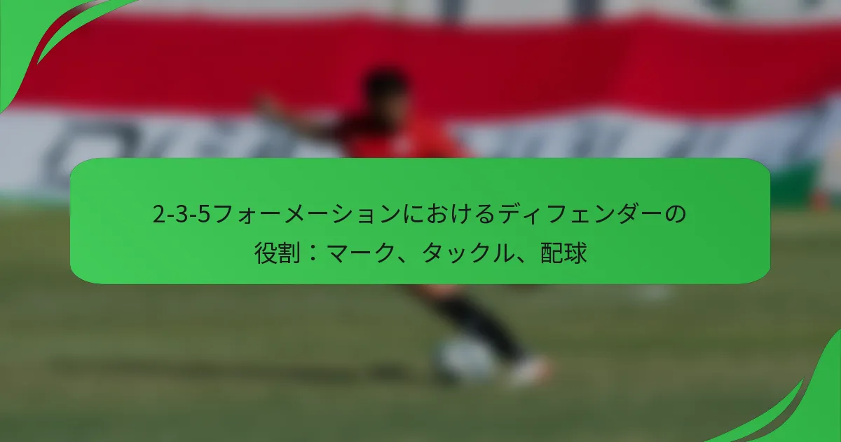 2-3-5フォーメーションは、攻撃的なプレーを重視し、2人のディフェンダーが重要なカバーを提供する伝統的なサッカーのセットアップです。これらのディフェンダーは、相手をマークする上で重要な役割を果たし、マンツーマンおよびゾーン戦略の両方を用いて得点機会を阻止します。さらに、効果的なタックルはボールを奪い返し、守備の安定性を確保するために不可欠であり、攻撃性と慎重さのバランスが求められます。 サッカーにおける2-3-5フォーメーションとは? 2-3-5フォーメーションは、2人のディフェンダー、3人のミッドフィールダー、5人のフォワードから成る伝統的なサッカーのセットアップです。このフォーメーションは攻撃的なプレーを重視し、相手のディフェンスを圧倒しつつ、適度な守備カバーを維持することを目指しています。 2-3-5フォーメーションの歴史的背景と進化 2-3-5フォーメーションは19世紀後半に登場し、20世紀初頭に人気を博しました。これは、より攻撃的なスタイルのプレーを求めるニーズに応じたもので、チームがより多くのフォワードを活用できるようにしました。時が経つにつれ、ゲームが進化する中で、このフォーメーションは守備の脆弱性について批判を受けるようになりました。 サッカー戦術が進化するにつれて、2-3-5は徐々に人気を失い、4-4-2のようなより良い守備の安定性を提供するフォーメーションに取って代わられました。しかし、その原則は現代の戦術にも影響を与え続けており、特にチームが攻撃と守備のバランスを取る方法において重要です。 2-3-5フォーメーションの主な特徴 攻撃的な焦点: 5人のフォワードによる攻撃プレーを優先し、多くの得点機会を創出します。 ミッドフィールダーのコントロール: 3人のミッドフィールダーは攻撃と守備の両方をサポートし、両者のリンクを提供します。 守備の制限: ディフェンダーが2人しかいないため、強力な攻撃選手を持つチームに対して苦戦することがあります。 幅と深さ: フォーメーションは幅広いプレーを可能にし、ウイングを利用して相手のディフェンスを引き伸ばします。 現代サッカーフォーメーションとの比較 4-4-2や4-3-3のような現代のフォーメーションと比較すると、2-3-5は守備カバーのバランスが劣ります。攻撃能力に優れている一方で、ディフェンダーの不足はカウンターアタックに対する脆弱性を招く可能性があります。現代のフォーメーションは、より堅固な守備構造を優先し、攻撃と守備の両方に対してより戦略的なアプローチを可能にします。 対照的に、4-4-2フォーメーションは、4人のディフェンダーと4人のミッドフィールダーによるより均等な選手の分配を提供し、守備の安定性を高めつつ、効果的な攻撃プレーを可能にします。4-3-3は同様の利点を提供しますが、幅とプレスを強調し、現代サッカーの速いペースに適応しています。 2-3-5フォーメーションの利点と欠点 利点: フォワードの数が多いため、高い得点能力があります。 攻撃的なプレーと創造性を促進します。 特に低レベルの試合では、相手のディフェンスを圧倒することができます。 欠点: 限られた守備選手のため、カウンターアタックに対して脆弱です。 攻撃の機会を活かすためには、高度なスキルを持つフォワードが必要です。 選手が役割を効果的に維持しないと、混乱を招くことがあります。 2-3-5フォーメーションにおける典型的な選手の役割 2-3-5フォーメーションでは、2人のディフェンダーは通常フルバックとしてプレーし、相手のウイングをマークし、守備をサポートします。3人のミッドフィールダーは、中央のプレイメーカーと2人のウイングを含むことが多く、守備と攻撃の間のプレーをつなぐ役割を担います。 5人のフォワードは、センターフォワードと4人の攻撃選手で構成され、ポジションを入れ替えて相手のディフェンスに混乱をもたらすことができます。このセットアップは、すべての選手に多様性と高い技術的スキルを要求し、攻撃のプレッシャーを維持しつつ、守備の責任を意識することが求められます。 2-3-5フォーメーションにおけるディフェンダーのマーク責任とは? 2-3-5フォーメーションにおけるディフェンダーは、マンツーマンおよびゾーン戦略の両方を用いた重要なマーク責任を持っています。彼らの主な目標は、相手選手がボールを受け取って得点機会を作るのを防ぎつつ、空間認識を維持し、ゲームの流れに応じて調整することです。 マンツーマンマークの技術 マンツーマンマークでは、ディフェンダーは試合中に特定の相手選手を密接に追いかける必要があります。この技術は、重要な選手の攻撃オプションを制限するのに効果的で、ディフェンダーはプレッシャーをかけて動きを妨げることができます。 主な技術には、マークされた選手との距離を近く保つこと、体の位置を使ってパスコースをブロックすること、相手の次の動きを予測することが含まれます。ディフェンダーは、相
